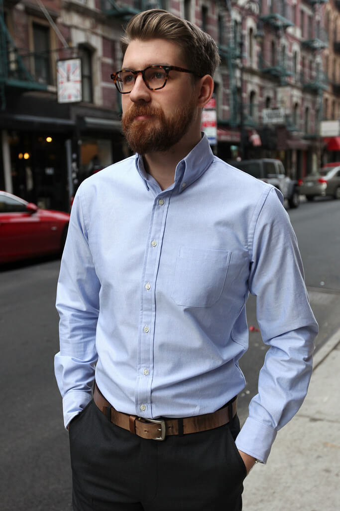 The third key point that I want to make is to start out buying items that are versatile, and can be worn in a number of outfits. A perfect example of this is a light blue oxford cloth button down (OCBD) shirt. The blue OCBD shirt can be worn dressed down with a pair of jeans, dressed up a bit under a wool sweater with tie, or dressed up even further with a sportcoat and wool trousers. See the following images for proof: