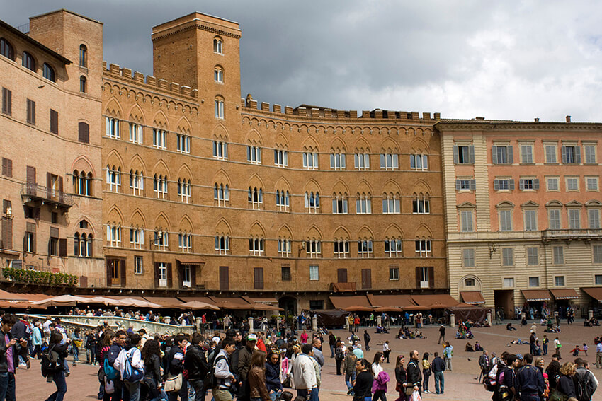 The most Important building in Siena, the Palazzo Pubblico, looks as if it had been designed by a clever 10-year-old using a Lego set. Balanced precariously on one end, a tower soars uneasily into the Tuscan sky. On the other side, the building veers sharply downward.