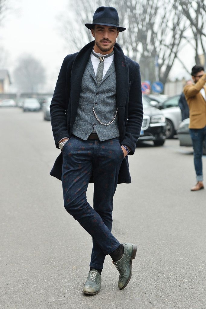 Classic elements of dandy style include items like a trench coat, cuff-links, blazers, scarves, and well-tailor pants. Depending on the occasion, you may also find elegant hats, gloves, vests, wing-tip shoes, or even a leather jacket. Fabrics like silk, linen and tweed are in heavy rotation.